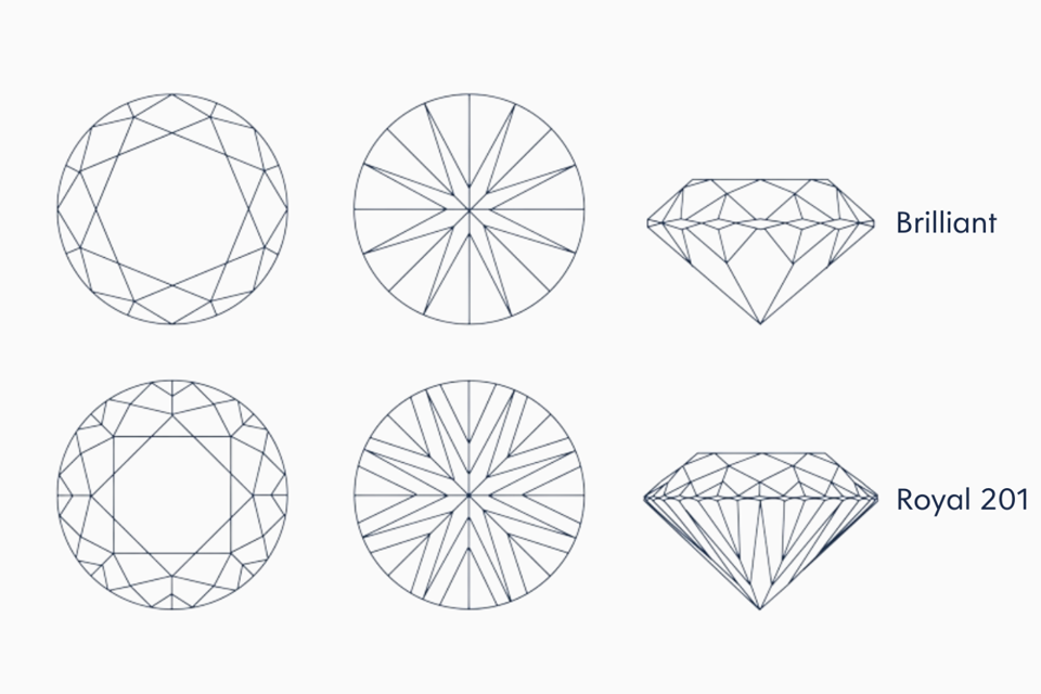 Al eeuwenlang streven diamantslijpers naar perfectie. De briljant werd lange tijd als norm gezien, maar de Royal 201 tilt deze standaard naar een hoger niveau. Door een innovatieve combinatie van verhoudingen, snijhoeken en micro-facetten op de rondist reflecteert deze diamant het licht intenser dan ooit tevoren. Het resultaat: een levendigheid en schittering die niet te vergelijken zijn met traditionele slijpvormen.